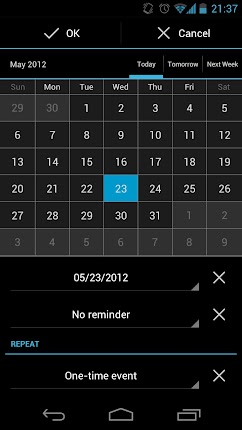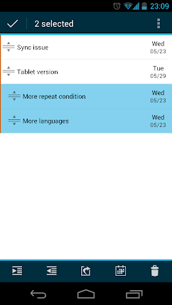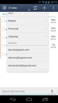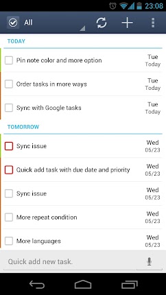 Overview: Synchronize Your To Do Tasks | List with Google GTasks is a simple and efficient android to do list app. It help you to organize your life in a simple and elegant way. It has both local mode and google account mode. You can sync with your google tasks perfectly. And you can share you list or your task item easily via gmail/note in reader/messaging /google docs and so on. ** Widget doesn't work if GTasks was installed on SD card,please move it back and reboot your device. ANDROID OS DOESN'T SUPPORT THAT!!! ** Features: 0. ICS(Android 4.0) style with bulk indent/move/set due date/delete and so on 1. Rich gtask (google task) client, simple todo list, checklist, note/notes pad tool. 2. Synchronize with multiple google accounts automatically, also support local mode. customize sync mode: auto,manual or sync when open/exit,background sync 3. batch add notes 4. scroll horizontally to switch between task/tasklist. 5. order your todo/notes items by due date/name/create order 6. order your task list easily by dragging them 7. view your events on google calendar 8. Indent, unindent, share, move easily 9. repeat reminder enable, set reminder one-time/daily/weekly/monthly... and so on 10. quick add task by pressing the search key 11. search all task with autocomplete match 12. Widgets(scrolling in LauncherPro/ADWLauncher/GO Launcher) New Premium Features - Background sync - Batch add tasks - Pattern lock to secure your information - Choose Themes What's in this version: 1.0.4 - fix widget font size issue - fix priority and repeater bug 1.0.2 - widgets improved - bugs fix 1.0.1 - Bugs fix 1.0.0 - new android 4.0 UI. - select google account on title bar. - batch set due date& move to other list & indent & delete etc. - improve drag&drop sort - search Code: https://play.google.com/store/apps/details?id=org.dayup.gtask http://www.directmirror.com/files/1QS6QQOD |