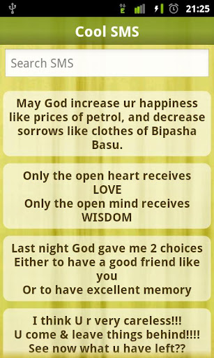 | 10000+ SMS Messages Collection v1.2 Posted: 14 Nov 2012 04:15 PM PST Over 10000 collection of SMS messages in more than 50 categories!!! The largest book of text messages collections on Android. Have fun messaging your friends with lots of funny, cute and sweet text messages. Features:- 1) Easily Search the SMS Collection Categories. 2) Search Messages within a category collections. 3) This app has clean, and simple interface theme, which looks great on your Phone or Tab and the interactions (scrolling, tapping) you do - feel natural and relaxing. 4) Swipe left or right to see the previous or next message. 5) Tap the message icon below to share your favorite message via SMS, E-Mail, Bluetooth, Facebook or Twitter. Note:- Need to have Facebook / Twitter app installed to share using Facebook / Twitter. List of some of the categories in this app : ★ ASCII SMS ★ Adult jokes ★ Anniversary Quotes/SMS ★ Birthday Wishes ★ Break up / Broken heart ★ Cool SMS ★ Cricket ★ Flirt & Kiss SMS ★ Dirty Jokes ★ Friendship and love ★ Good Morning Messages ★ Good Night Messages ★ Greetings & Wishes ★ Halloween / Thanksgiving texts ★ Hindi SMS ★ Sad & Sweet Love SMS ★ Love Poems and Quotes ★ Miss You poems ★ Mother's Day Wishes ★ Naughty texts ★ Punjabi Pashto & Marathi SMS ★ Quotes SMS collection ★ Romantic / Romance sms ★ Funny & Humorous SMS Jokes ★ Short text messages ★ Santabanta jokes ★ Smileys for Texting ★ Sorry Texts ★ Shayari & ghazals - Hindi ★ Tamil SMS & Kadi Jokes ★ Valentine's day sms Quotes ★ And many more categories of cute and sweet text messages & quotes for him, her, lover, wife, husband and even to send to your family... Enjoy messaging & texting with nice, short and sweet templates from our free messages app! Improved the Look and Feel. Improved SMS readability. Fixed SMS prefix bug. play https://play.google.com/store/apps/d...ges.collection Download http://www.filedownloads.org/p7qmv6h...0v1.2.apk.html Mirror http://ul.to/05txbh4k |