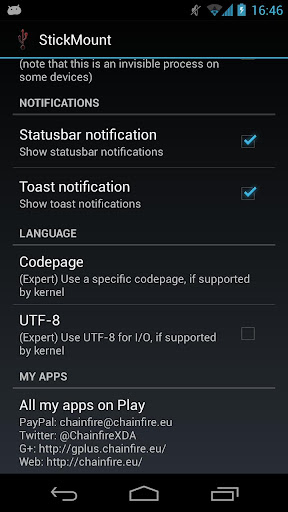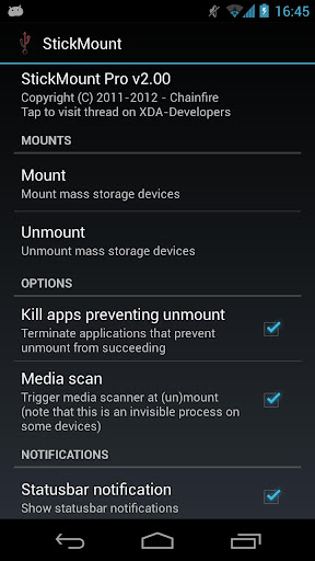| Posted: 02 Dec 2012 06:44 PM PST Requirements: 4.0 and up, !!! REQUIRES ROOT !!! Overview: Automatically mount and dismount USB sticks on various devices like the Galaxy Nexus and Nexus 7 Various Nexus and "stock Android" devices do not automatically "mount" mass storage devices (such as USB sticks). StickMount has been made to solve this problem, and give you access to the files on your USB connected storage from all your apps. StickMount is known to work on many devices, but is built *only* with *Nexus* devices in mind. Once StickMount is installed and you connect a USB stick with a "USB host / OTG cable", the device will show you a popup if you want to open StickMount. It is advised to tell the device that you want to do this by default. If you have just installed StickMount and you already had a USB stick connected, you must manually launch the program, or disconnect/reconnect the USB stick for StickMount to start working. Mass storage devices are mounted to "/sdcard/usbStorage/xxxx/". ----- (Pro) Kill apps preventing unmount ----- Sometimes an app has a file in use located on the USB device, and won't let go of it. This can prevent StickMount from unmounting the USB device. It will seem like the device stays connected (this is harmless). StickMount Pro provides an option that attempts to kill (terminate) all the apps that are preventing the unmount from succeeding. ----- (Pro) Media scan ----- StickMount Pro supports triggering the media scanner on each (un)mount action. This will automatically make the files on your USB device available in apps like Gallery and Music. Please note that the media scanner is not a visible process on all Android devices - it might actually work silently in the background without any visual cues. It may take a minute for your files to show up, so don't panic if they don't show immediately. Even if you have this option enabled, you can prevent folders from being scanned by placing an empty file called ".nomedia" in that folder. If you put it in the root of the USB device, the entire device will not be scanned. ----- Filesystem support ----- The filesystems supported depends on your device firmware. On most devices, at least vfat/fat/fat32 and ext2/3/4 are supported. On the latest Android versions, ntfs is also supported in read-only mode. Some devices also support exfat out the box, but most do not. StickMount can utilize the "ntfs-3g" and "mount.exfat-fuse" binaries to add support for ntfs (untested) and exfat, but these are not included. If you place the "ntfs-3g" or "mount.exfat-fuse" files in the root of your internal storage ( /sdcard ), StickMount will automatically use them. What's in this version: - More Android Jelly Bean 4.2 related fixes - Only works for primary user - Twitter/G+ spam now included play https://play.google.com/store/apps/d...ire.stickmount https://play.google.com/store/apps/d...stickmount.pro Download http://www.filedownloads.org/dbpnz4j...46387.rar.html Mirror http://ul.to/djffx44g |